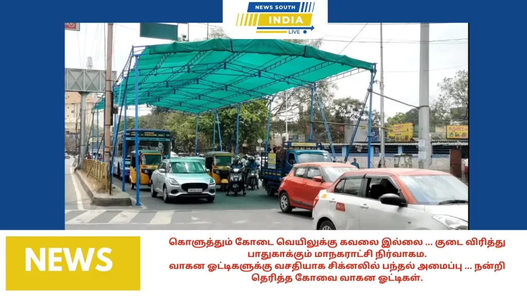 இந்த நிலையில், கோவையில் வாகன ஓட்டிகளை வெயிலிலிருந்து காக்க, குடை விரைத்திருக்கின்றனர் மாநகராட்சி .