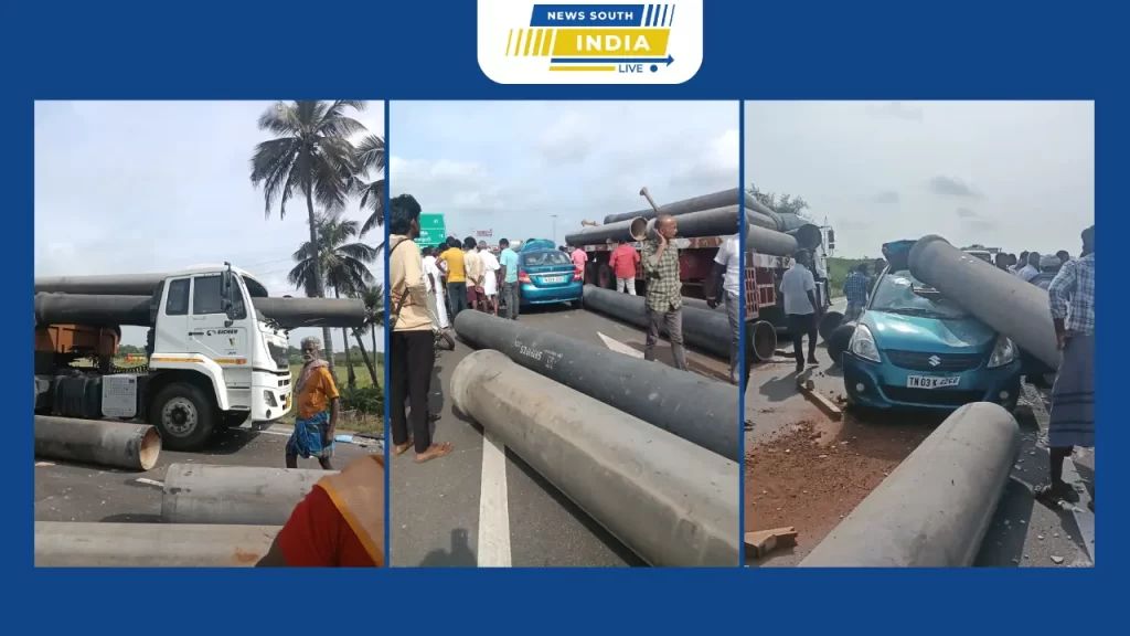 தஞ்சாவூர் மாவட்டத்தில் இருந்து திருவாரூருக்கு கண்டெய்னர் லாரி மூலம் குடிநீர் இரும்பு குழாய் ஏற்றி வந்த லாரி வலங்கைமான் அருகே நார்த்தங்குடி என்ற இடத்தில் குழாயினை கட்டியிருந்த கயிறு அறுந்து குழாய் சாலையில் சென்ற கார் மீது விழுந்ததில் கார் சேதம் உயிர் சேதம் ஏதும் ஏற்படவில்லை சம்பவம் குறித்து போலீசார் விசாரணை
